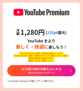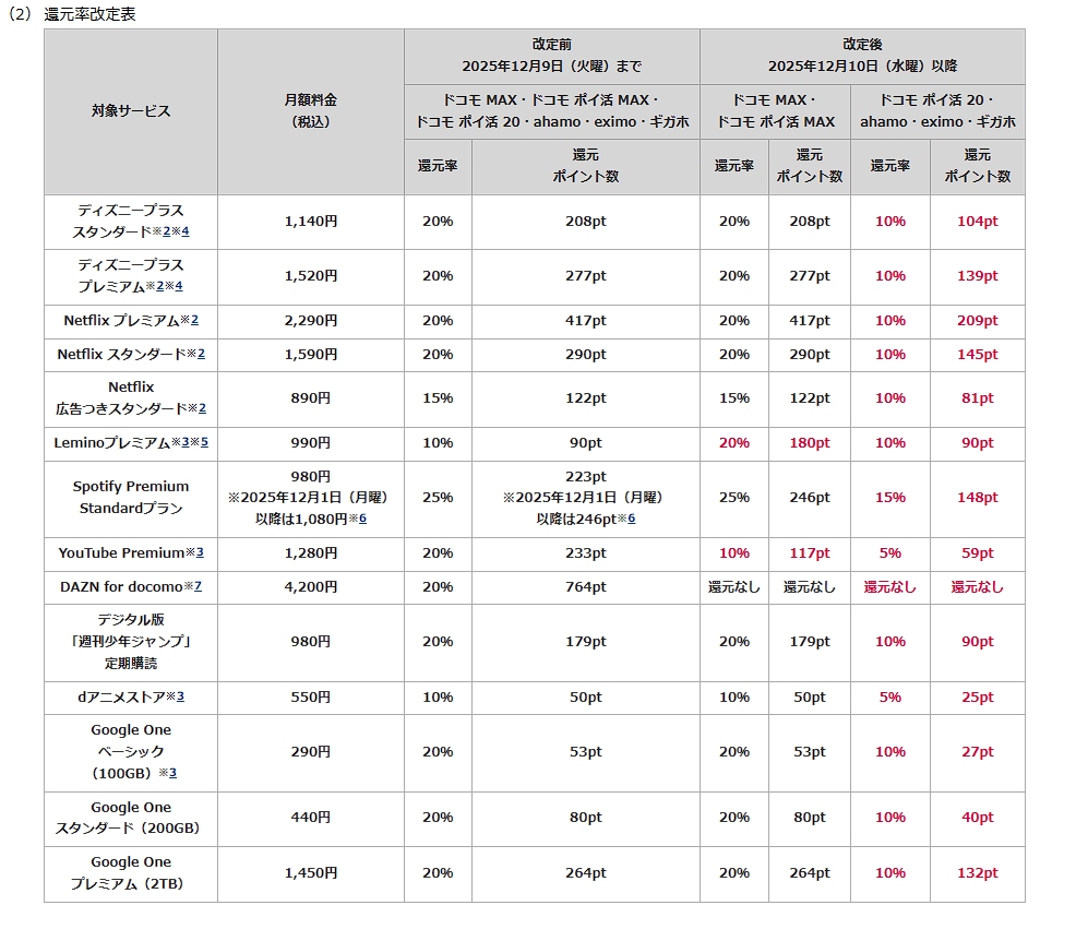 特筆すべき点は、ahamoユーザにてYouTube Premiumの還元率が、20%→5%に変更されること